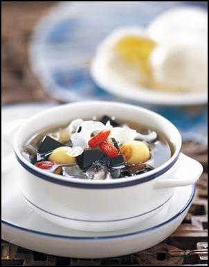 ??? 比如綠豆羹龜苓膏,成份是龜苓膏粉、綠豆羹、煉乳。自己做是將龜苓膏粉沖調(diào)成厚的龜苓膏,切成小塊,放入碗中,然后在碗中加入綠豆羹,也可依據(jù)個人口味添加煉乳,冷藏后食用更佳。它可以清熱解毒、消暑除煩、止渴健胃、清熱去濕,初秋食用這道綠豆羹龜苓膏是最好不過的了。