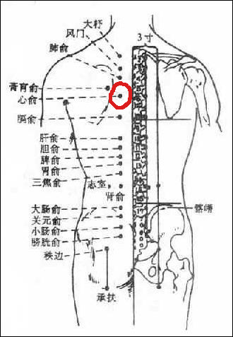 心俞,經(jīng)穴名。出《靈樞·背腧》。屬足太陽膀胱經(jīng)。心之背俞穴。在背部,當(dāng)?shù)?胸椎棘突下,旁開1.5寸。布有第五、六胸神經(jīng)后支的內(nèi)側(cè)皮支和外側(cè)支,肋間動、靜脈后支的內(nèi)側(cè)支和頸橈動脈降支。