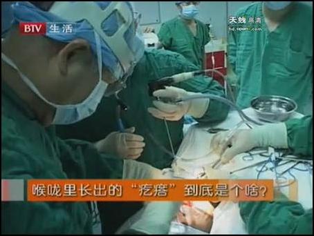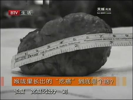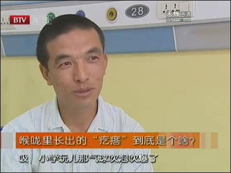 2009年11月,北京電視臺生活頻道《你該怎么辦》欄目組,制作了一期<揭秘喉嚨里神奇長出離奇小“疙瘩”>的節(jié)目,節(jié)目中的主人公是一位家住山西朔州的29歲小劉先生,節(jié)目錄制時,正住在解放軍總醫(yī)院第一附屬醫(yī)院耳鼻喉科的病房里,等待醫(yī)生們的進一步治療。由于主人公小劉先生喉嚨里長了一個異常的大疙瘩,因此瞬時間備受媒體關注。那么到底是怎樣的一個異常的疙瘩?醫(yī)生們又是如何為他治療的,讓我們一同來揭曉!