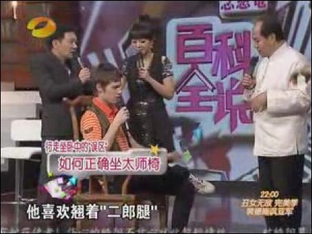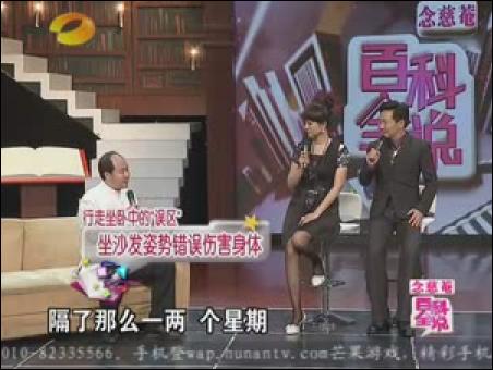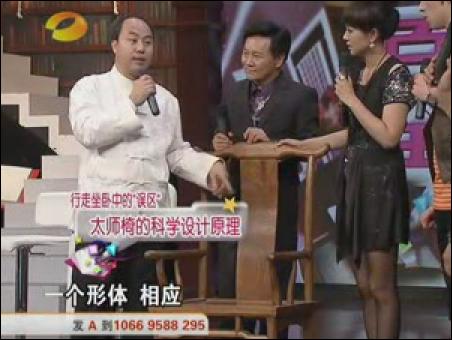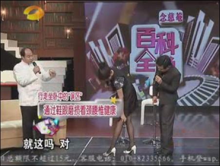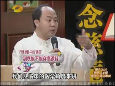 名醫(yī)胡國忠一上臺就批評主持人方瓊穿高跟鞋過度,小腿和大腿之間的腳踝處(委中穴)有明顯的腫塊。名醫(yī)說:“女性穿高跟鞋,每天最好別超過3個小時”不僅如此,名醫(yī)還批評睡軟床的年輕人。名醫(yī)說:“年輕人最好睡硬板床,對身體有好處?!闭劦阶危t(yī)推薦坐太師椅,稱太師椅符合人體結(jié)構(gòu)。并在《百科全說》節(jié)目現(xiàn)場,親自示范如何正確坐太師椅。