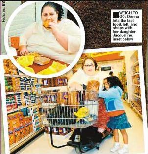 就這樣,唐娜每天毫無節(jié)制地山吃海喝增加體重,她每天都要吃掉熱量總計高達(dá)12000卡路里(食物熱量,一個正常人一天攝取總熱量為2000卡路里。)的食物,同時盡可能地讓自己減少運動。通常情況下,她一天要吃4個漢堡包和薯條、1條抹滿花生醬和果醬的面包、1個大比薩餅、1個帶冰淇淋和奶油的巧克力蛋糕、12個紙杯蛋糕、2個烙餅和蘇打汽水若干,還有肉餅和土豆泥等。每個星期她就要花掉400英鎊買食品。