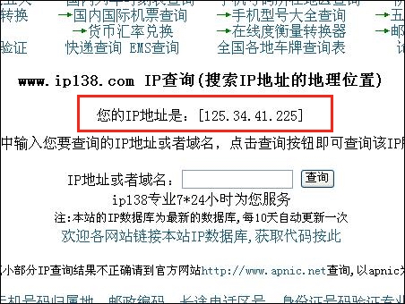 查詢你的IP地址可點(diǎn)擊此網(wǎng)頁:http://www.ip138.com/?jdfwkey=fbrnn2