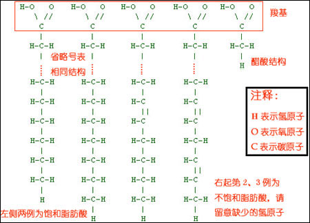 碳?xì)滏溣悬c(diǎn)像自行車鏈條,每節(jié)的樣子都差不多,一般是由一個(gè)碳原子和兩個(gè)氫原子構(gòu)成的。可是不知什么原因,在很多脂肪酸中,有些鏈條的氫原子缺失了。關(guān)鍵地方到了,這些氫原子缺失的脂肪酸,被稱為不飽和脂肪酸。相對的,氫原子不缺的脂肪酸叫飽和脂肪酸。