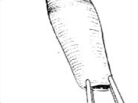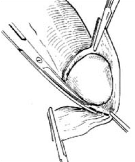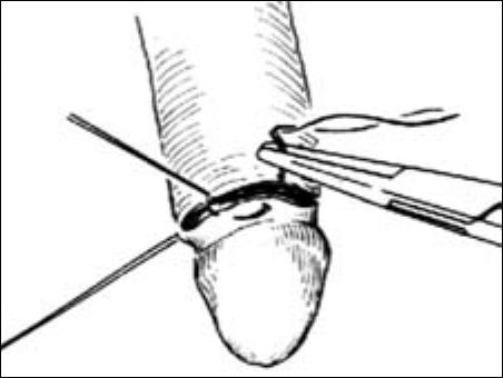 4.設(shè)計(jì)切口。用一把止血鉗夾住包皮系帶處,以提起包皮。以刀尖在包皮外板距冠狀溝緣遠(yuǎn)端0.5cm處劃一切痕,準(zhǔn)備作為環(huán)切切口,要防止切除過(guò)多。