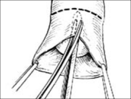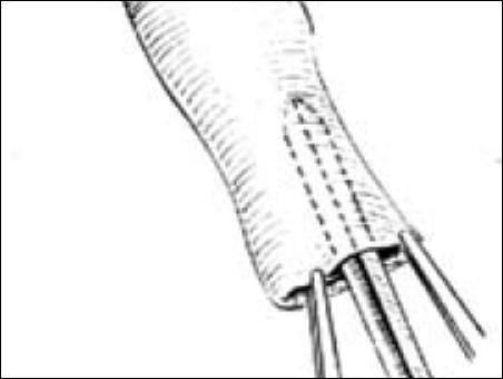 8.縫合 用細(xì)絲線先在環(huán)形切口的背、腹、左、右處各縫合一針,結(jié)扎不要太緊,以免組織水腫時(shí)勒壞皮膚。縫線不剪短,留作固定敷料用。再用每?jī)舍樋p線之間縫合1~2針,縫針應(yīng)靠近切緣穿出[圖2 ⑺]。