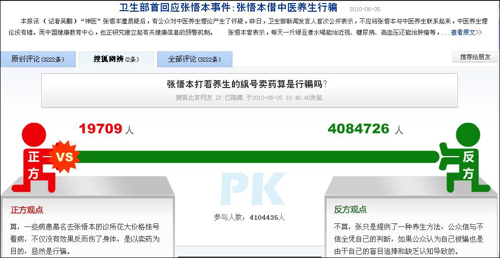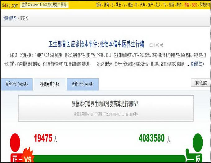具有超級諷刺意味的是,SOHU一方面抨擊張悟本,一方面,又做了一個對“張悟本是否是騙子的調查”,結果,截止6月6日晚21:46分為止,總共有4103040人參加調查,認為張悟本是騙子的為19471人,僅占總人數的0.47%;而認為張悟本不是騙子的是4083569人,占總調查人數的99.5%。是非曲直,大家一目了然。http://comment2.news.sohu.com/default/debate.shtml?c=140390675&t=272580884,大家去這里看一下就明白了。