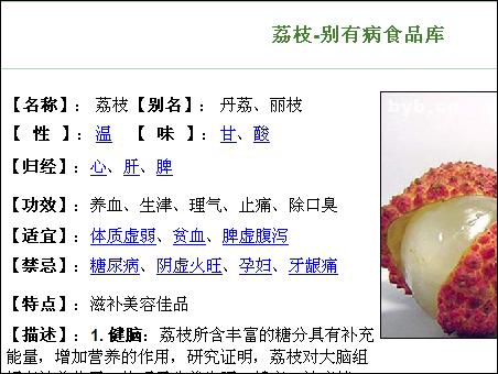 比如,在“適宜”一項中,點“貧血”,你就會查到,哪些食物,同荔枝一樣,同樣適宜貧血的人吃。再如,在“味”項中,點擊“酸”,你點擊,同樣也會查到更多與荔枝一樣味酸的食物。