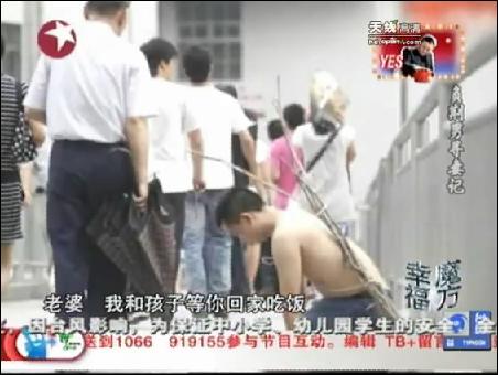 幾天后,余海翻然悔悟,苦苦尋妻不得,情急之下,脫光上衣,身背荊棘,跪倒在廣州鬧市的人行過街天橋之上,負(fù)荊請(qǐng)罪,希望老婆能看到他后回家......