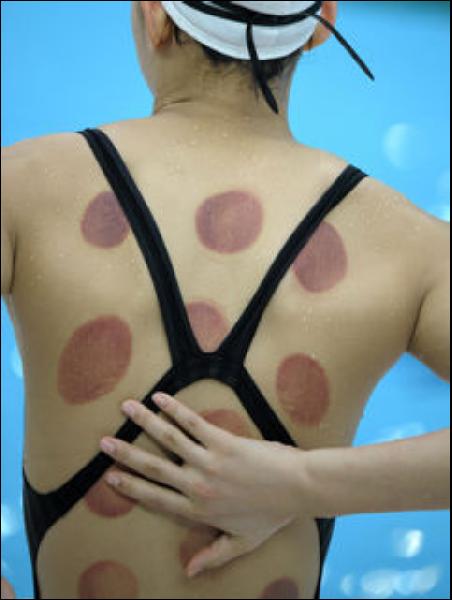 北京奧運(yùn)會上中國游泳運(yùn)動員王群后背的罐印,應(yīng)是留罐法的痕跡