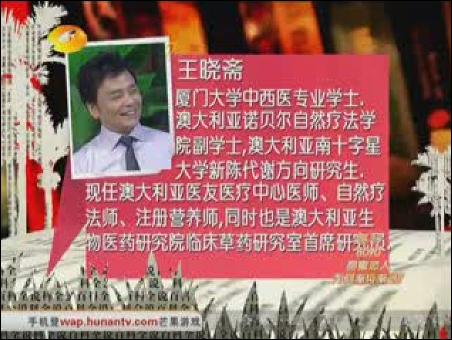 【byb.cn】?2010年10月11、12日,湖南衛(wèi)視百科全說邀請到澳大利亞醫(yī)友醫(yī)療中心醫(yī)師, 澳大利亞生物醫(yī)藥研究院臨床草藥研究員王曉齋,為您一一分析,不同疾病的不同中西醫(yī)治療方案,幫您找對醫(yī)生。在談?wù)撝形麽t(yī)診病治病之道時,他提出中醫(yī)診病是以人為本,而西醫(yī)是以病為本的觀點,引發(fā)現(xiàn)場觀眾的驚嘆......