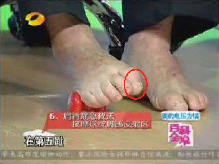 首次亮相的,是“吳若石+鄭英吉”組合。節(jié)目的“看點”就是“洋人”。吳若石,瑞士人,號稱是“足底按摩之父”。我們姑且不論他是不是足底按摩之父,從他的面相和身材看,我認為他身體并不大健康,疑似有心腦血管病,最最讓人不可思議的是,作為足底按摩之父,他應(yīng)該有一雙完美的腳才對,但是他的腳,不僅肥厚,似乎還有點腫,特別是大拇指上居然還有灰指甲,很顯然,說明其微循環(huán)并不好。