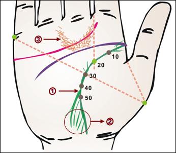 在四十五歲點(diǎn),生命線分兩道下行,表示下半身較弱。由于血行不暢及貧血。天氣轉(zhuǎn)寒或入冷氣受涼易發(fā)下肢痛和腰痛,需善為保護(hù)。生命線末端分岔,是未來體力衰退之兆,宜注意日常營養(yǎng)補(bǔ)給,改善貧血。金星帶有小縱線叢集,是婦科障礙線,注意節(jié)制性生活。