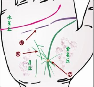 感情線上有許多細(xì)短線橫切。水星丘脹高,多縱橫小紋且模糊不清。此處的感情線通常較薄或有斷口。健康線含糊而淺,有岔線。金星丘或月丘發(fā)紅,有紅、紫、茶色斑點。