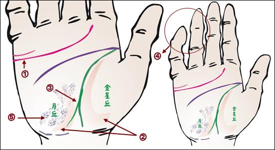掌肌滑溜溜的,多有風(fēng)濕病。手指關(guān)節(jié)腫而痛。感情線起點(diǎn)處成雙,多有痛風(fēng)。金星丘、月丘的隆起肌肉很瘦薄,筋力不足。生命線末端分叉成兩股,末端擴(kuò)散,表示風(fēng)濕晚期行走有問題。尾指、無名指不能自由屈伸,老是彎曲,是風(fēng)濕性神經(jīng)麻痹。手腕周圍到月丘下,出現(xiàn)暗紫黑斑,通常是風(fēng)濕癥腰部障礙,腳踝內(nèi)側(cè)也會(huì)呈現(xiàn)類似色調(diào)。