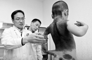 眼前的一幕叫人揪心,脫了衣服的明明身上都是斑斑點(diǎn)點(diǎn)的黑皮膚。尤其后背這一大片,醫(yī)生用尺子量了量長(zhǎng)寬都在35厘米左右。此外,他的小肩膀、臀部、下肢沒(méi)有一處是完整白凈的皮膚。有的黑皮膚處還長(zhǎng)出黑色的絨毛。接受檢查時(shí),好動(dòng)的明明很配合。這個(gè)3歲的孩子急切地想治好自己的病,此情此景讓在場(chǎng)的人心頭一緊,頓生憐憫之心。