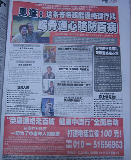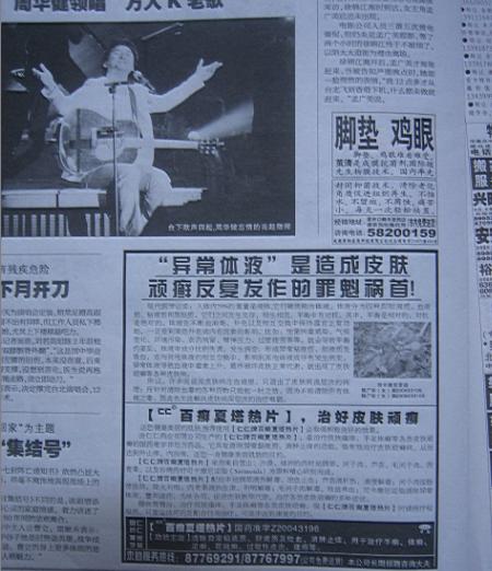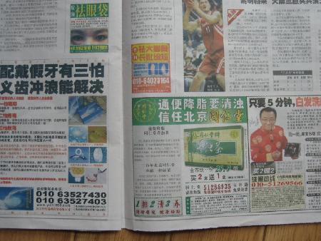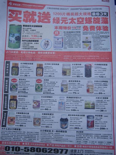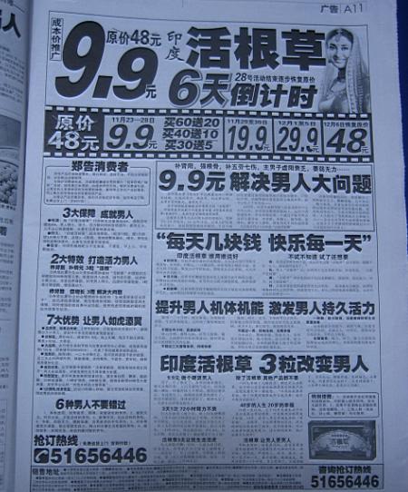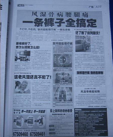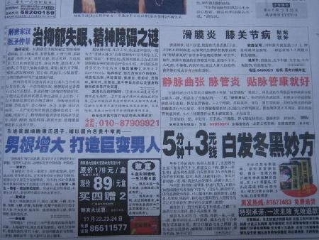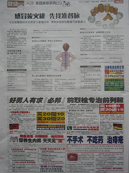 我家里也訂了一份,每天看看,確實也挺不錯的.由于關(guān)注健康產(chǎn)業(yè),對報紙上的相關(guān)信息也留意了一些.但今天,真的給我驚著了,今天,2008年11月22日,周六,農(nóng)歷節(jié)氣是小雪.今天我看到<法晚>的32個版面,涉及藥品、保健品、醫(yī)療器械的廣告,將近8個整版,也就是說,僅醫(yī)療相關(guān)的廣告,就占了當(dāng)天報紙的四分之一,這還不算是其他的軟廣告內(nèi)容,以及其他內(nèi)容的廣告。
