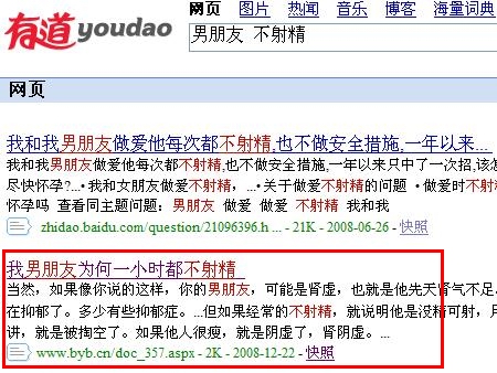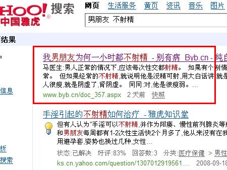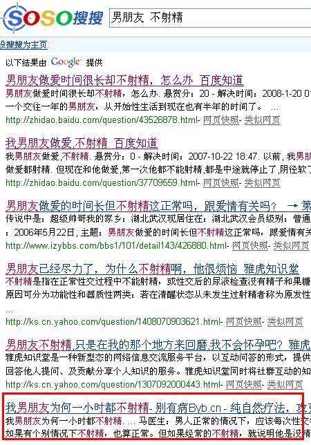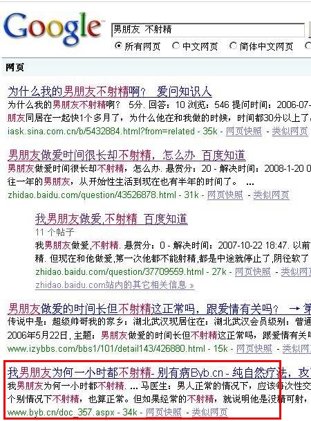 以本站昨天(2008年12月22日上午10點(diǎn))發(fā)的文章,我男朋友為何一小時(shí)都不射精為例,23日18點(diǎn)搜索查詢結(jié)果: