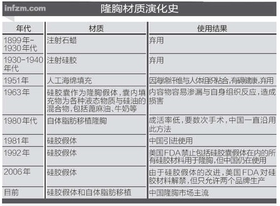 以注射式隆胸為例,其最早在美國(guó)使用。1899年1930年代,注射石蠟,但因致命而棄用。上世紀(jì)三四十年代,日本、美國(guó)等國(guó)注射硅膠,也因致命而棄用。