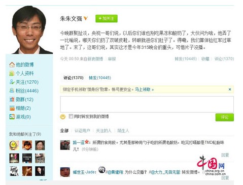 這位經(jīng)濟(jì)觀察報(bào)調(diào)查新聞部記者朱文強(qiáng)的微博原文為“今晚群聚扯淡,央視一哥們說(shuō),以后你們誰(shuí)也別吃果凍和酸奶了,大伙問(wèn)為啥,他弄了一比喻說(shuō),哪天你們?nèi)恿穗p破皮鞋,轉(zhuǎn)眼就進(jìn)你們肚子了。得嘞,我們算體驗(yàn)紅軍過(guò)草地了。末了,這哥們說(shuō),其實(shí)這才是今年315晚會(huì)的重頭,可惜片子沒(méi)播?!?/p>