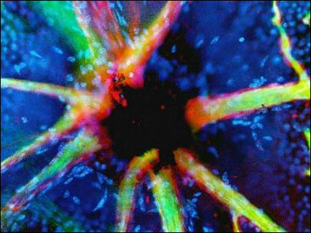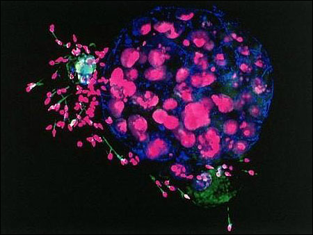 這看起來像個戰(zhàn)事不斷的世界,但事實上它是一個受精5天后的卵子,一些精細(xì)胞仍粘貼在它表面。這張色彩艷麗的美麗圖片,是利用共聚焦顯微鏡拍攝的。胚胎和精細(xì)胞核呈紫色,而精子的尾巴是綠色。藍(lán)色區(qū)域是縫隙連接(gap junction),它們把細(xì)胞彼此聯(lián)系在一起。