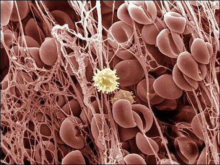 還記得你剛剛看到的形狀統(tǒng)一的紅血球圖片嗎?這張圖看起來像是紅血球粘在了粘性網(wǎng)上,形成血液凝塊。位于中間的那個細(xì)胞是白血球。