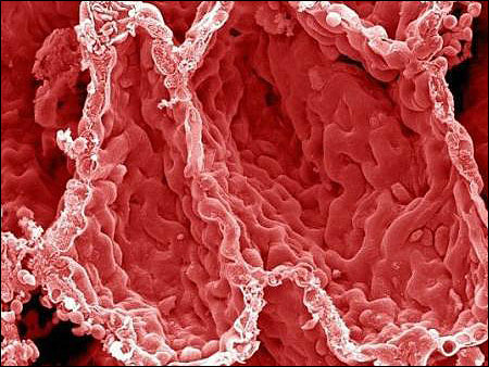 這張彩色圖片顯示的是人類肺部內(nèi)表面。圖中的洞穴是肺氣泡,這里是血液交換氣體的地方。