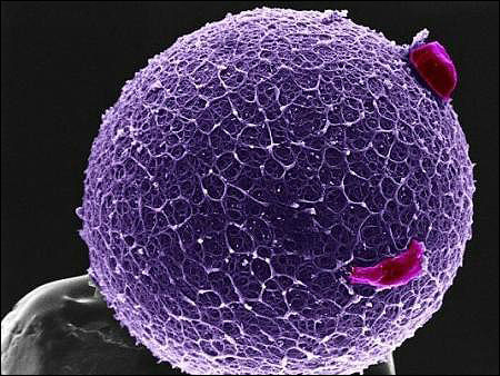 這張彩色圖片上的紫色人類卵子坐落在一個柱狀物上。它上面包裹一層透明帶狀物——醣蛋白,這種物質(zhì)既具有保護(hù)卵細(xì)胞的作用,又能誘捕和限制精子。兩個紅色冠細(xì)胞粘貼在透明帶狀物上。