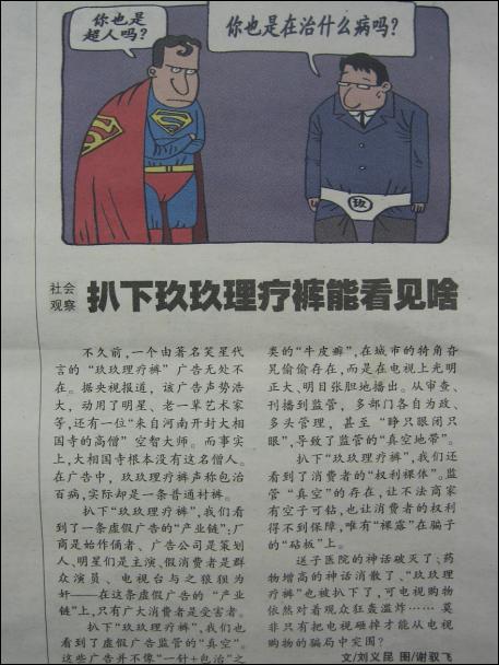 我們希望《法制晚報》負起對社會的責(zé)任感,不要一而再再而三地刊發(fā)虛假醫(yī)療廣告;我們也希望政府職能部門能有所作為;我們也希望廣大消費能多花一點時間學(xué)習(xí)一下相關(guān)的健康養(yǎng)生保健知識,只有這樣,我們才能不受騙,或者少受騙。