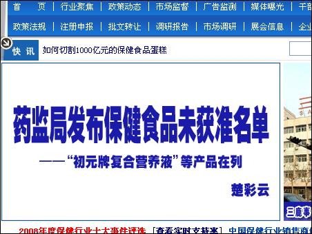 從表中我們還以看到一個非常熟悉的名字"初元牌復合營養(yǎng)液”。近年來,"看病人,送初元”的廣告不斷充斥于耳,據(jù)了解目前大做廣告的初元牌復合營養(yǎng)液并不是經(jīng)過審批的保健食品。據(jù)業(yè)內(nèi)人士披露:"初元”其實隱喻的是"出院”,與其廣告語有"異曲同工”之意,卻隱借了保健品的內(nèi)涵大肆宣傳,這無疑會誤導消費者將其當作保健食品購買,而此類產(chǎn)品(未獲得保健食品批準文號)在市場中還大有所在。