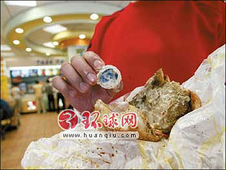 徐先生夫婦2005年在馬連道肯德基餐廳吃黃金烤雞腿堡時(shí),吃出了一只瓶蓋。 “幸虧我反應(yīng)及時(shí)沒(méi)有咽下去,否則卡在食道里就危險(xiǎn)了?!毙煜壬f(shuō)。該餐廳經(jīng)理承認(rèn)這只漢堡內(nèi)有異物是店方的責(zé)任?!捌可w是用來(lái)噴醬的噴槍頭,有可能槍頭松動(dòng)連醬料一同噴進(jìn)了漢堡內(nèi)未被發(fā)現(xiàn)。”