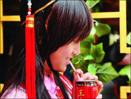 清朝時,王老吉在廣東很暢銷? 圖為穿古典服飾的女孩喝王老吉。