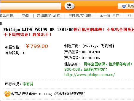 【byb.cn】?好消息,飛利浦1861榨汁機(jī)現(xiàn)在又賣799元了,這是近幾個(gè)月來(lái)的最低價(jià),需要的朋友,請(qǐng)抓緊時(shí)間購(gòu)買。
