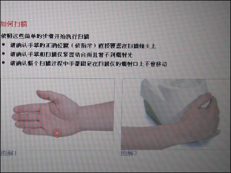 測(cè)試者將手貼在光掃頭上
