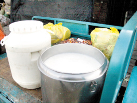 ??? 聽到老人的介紹,手中忙著給顧客稱奶的外地婦女借機(jī)再次做起宣傳:“咱家自產(chǎn)的牛奶,都是當(dāng)天剛剛擠的,大家就放心喝吧,咱絕不給牛奶加其他東西。”說著,她邊掀起裝有熱牛奶的罐蓋,邊指著上面漂浮的一層奶皮說道:“大家看咱這牛奶多濃。尤其是老年人,喝咱的牛奶才有營養(yǎng)。誰要是不信,我可以帶你們看看俺家養(yǎng)的牛?!?